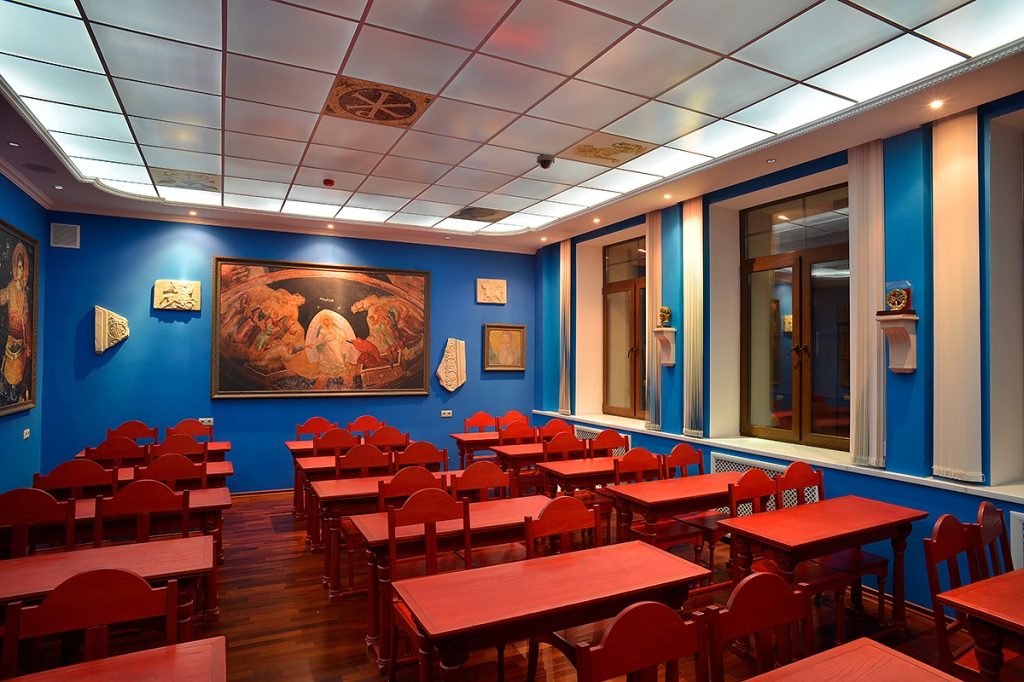 Пройдя по первому этажу, спустимся вниз, чтобы на минуту заглянуть в актовый зал семинарии. Различные собрания, встречи студентов с интересными людьми, презентации книг Издательства Сретенского монастыря — все это здесь.