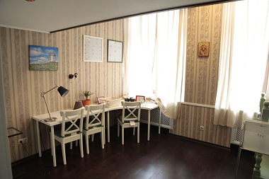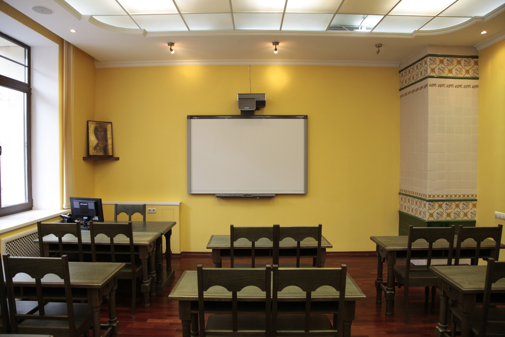 Аудиторию украшает русская иконография Ангелов кисти преподобного Андрея Рублева. А в углу аудитории — облицованная изразцами печь (стилизованная, конечно, но очень уютная).