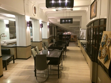После «Византии» нам открывает двери другая империя, преемница ее богатого наследия, прежде всего в отношении веры, — «Святая Русь». И вот разлилась Россия по континенту, как река Клязьма в половодье, и в сердце ее сияет православная вера, как собор Покрова-на-Нерли. Панно с этим сюжетом — доминанта комнаты — занимает всю фронтальную стену.