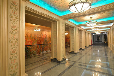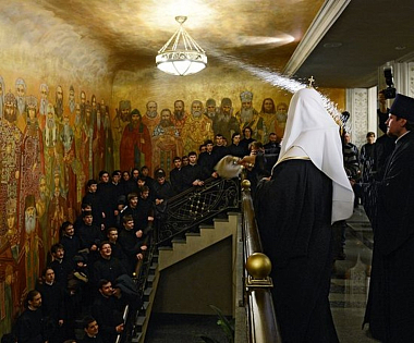 В вестибюле на первом этаже нас сразу заставляет остановиться удивительная фреска «Христос и Его ученики». В центре — Господь наш Иисус Христос, а по обе стороны — Его ученики: апостолы, мученики, святые отцы, подвижники. В этом же ряду можно увидеть Ф.М. Достоевского, Н.В. Гоголя… Они тоже ученики Христа. Здесь же и патриарх Алексий II, и отец Иоанн (Крестьянкин), и почившие монахи Сретенского монастыря.