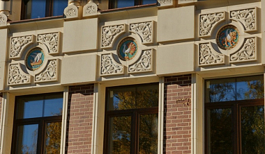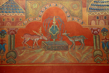Снаружи стены нашей любимой семинарии украшают объемные орнаменты византийской традиции и удивительной красоты майоликовые панно: одно — исполненное на сюжет «Святой Пророк Божий Иоанн Предтеча — Ангел пустыни», другое — посвящено священномученику Илариону (Троицкому), покровителю монастыря и семинарии. И то, и другое рассказывают о восхождении к Богу.