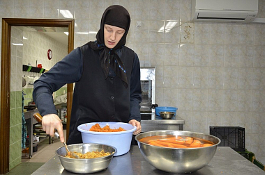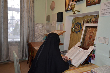 Обед в монастыре в 12.00, ужин в 19.00. В 21.00 сестры собираются в храм на вечернее молитвенное правило, состоящее из трех канонов – Господу, Божией Матери и Ангелу Хранителю – вечерних молитв и помянника, чтоб возблагодарить Господа за Его щедрую милость и помощь во всех наших нуждах, житейских и духовных.