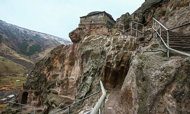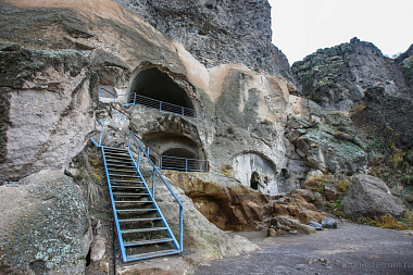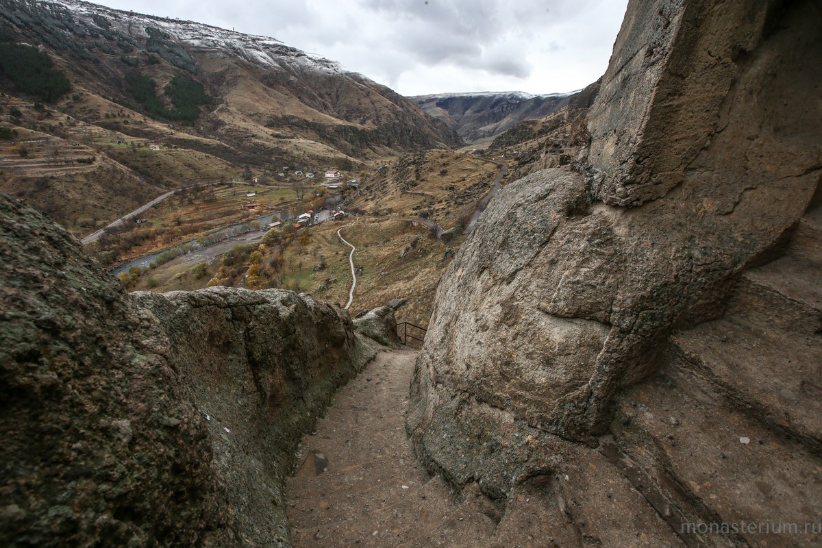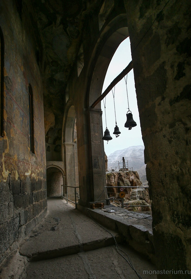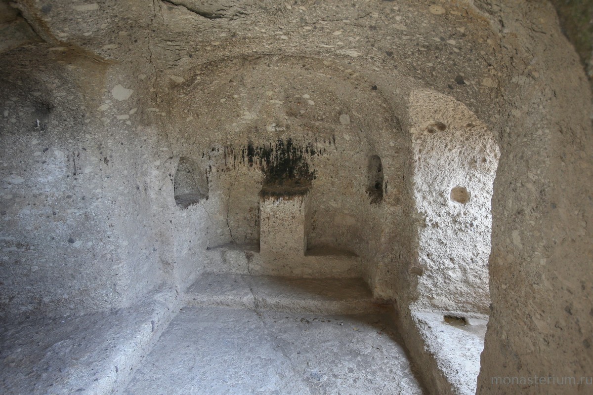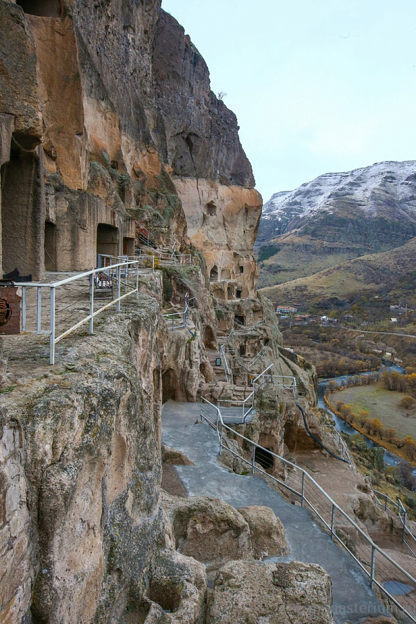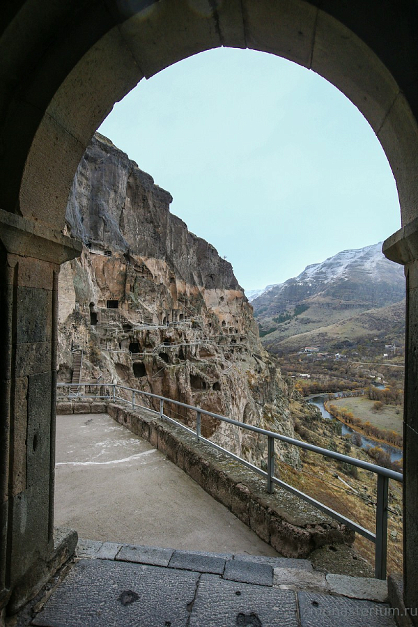 История монастыря берет свое начало в XII веке, когда грузинский царь Георгий III понял, что для защиты Грузии ему необходимо иметь на границе с Персией и Турцией хорошо укрепленную крепость. Он долго искал подходящее место, и Господь привел его к горе Эрушети (Медвежья гора). Ее отвесная стена, обращенная к долине реки Куры, была сделана из туфа (легкая и пористая горная порода – Ред.) и идеально подходила для создания подземного города. По приказу царя в Эрушети начали вырубать пещеры. Причем делали это поистине с царским размахом! Вдоль берега реки в сердце горы прорубили свыше 600 помещений, связав их между собой запутанными ходами и галереями. Из подземного города-крепости на поверхность вели лишь три скрытые от глаз входа. При необходимости долгую осаду под горой могли бы выдержать порядка 20 тысяч человек! Здесь всё было приготовлено для нормальной жизни: помещения для сна и отдыха, хранилища еды и резервуары с водой, трапезные, бани, библиотеки…