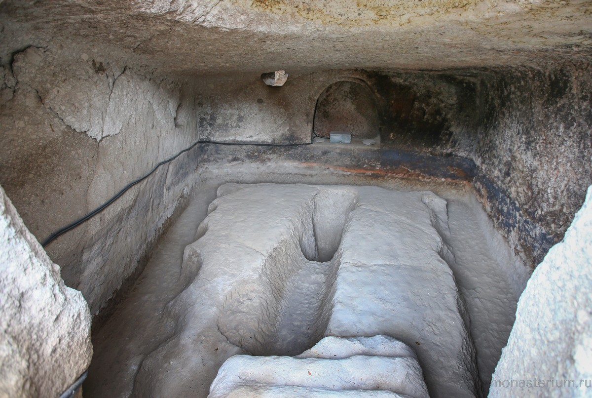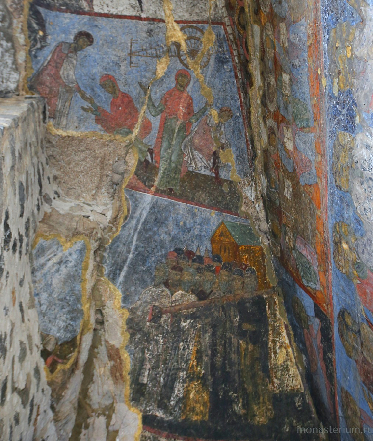 Сам храм представляет собой большой зал с закруглением в восточной части. Под алтарем есть потайной ход, ведущий в помещение, где хранились церковная утварь и одеяния священнослужителей. Особую ценность храма Успения Пресвятой Богородицы составляют его уникальные фрески. В алтаре можно увидеть изображение Богородицы с архангелами, а ниже – изображения 12 первосвященников со свитками в руках. На своде подземного храма, несмотря на прошедшие 9 веков, сохранились фрески с различными евангельскими сюжетами: Благовещение, Рождество, Сретение, Крещение, Преображение, воскресение Лазаря, Вознесение, сошествие Святого Духа и Успение Пресвятой Богородицы. На одной из стен храма можно увидеть и фреску, изображающую царя Георгия III и царицу Тамару.