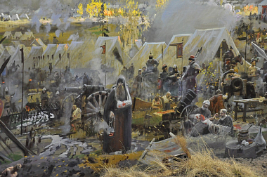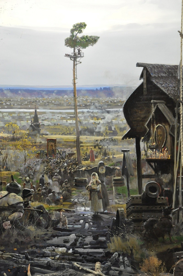 И, конечно, взгляд невольно охватывает всю Угру. На холсте, как и тогда в XV веке, река разделяет ордынскую рать и московские полки. Из летописей известно, что многие чудесные события во время Великого стояния произошли под покровительством Божьей Матери. Именно поэтому Угра после победы над ордынцами стала называться Поясом Пресвятой Богородицы. Летописец так сообщает об этом: «…и могу нарещи ту реку (Угру) пояс самыя Пресвятыя Богородицы, аки твердь от поганых защищающу Русскую землю». Почему же это великое событие на Угре до сего времени относится к разряду недооцененных в истории? Лишь потому, что земля глубоко не пропиталась кровью погибших за Отечество его сынов, или потому, что тогда не случилось жестоких сражений? Но ведь огромная ценность самой военной кампании в том и заключается, что благодаря искусной оборонительной стратегии Великого Московского князя Ивана III, который вынуждал хана Ахмата вступать в бой в невыгодных для ордынцев условиях, удалось сохранить многие тысячи жизней русских защитников!